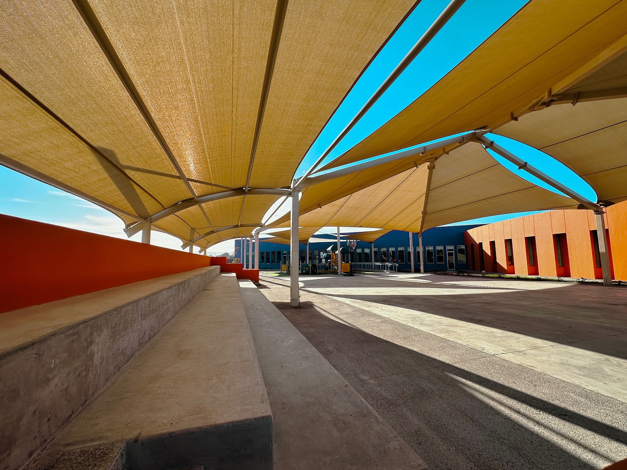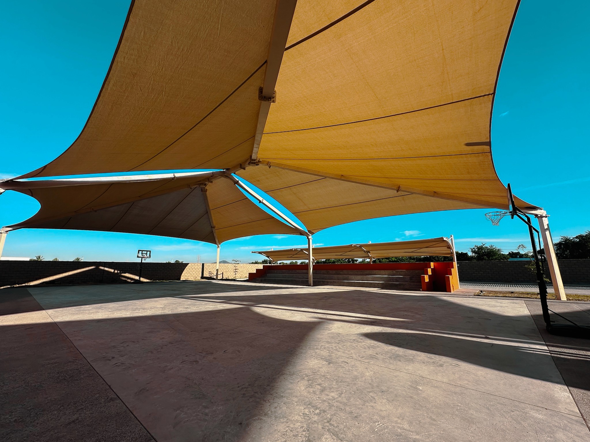 Diseñamos e instalamos una tensoestructura con malla sombra para cubrir la cancha de basquetbol del CRIT Mazatlán. Esta solución brinda protección solar efectiva para los usuarios, mejora el confort térmico y permite el uso continuo del espacio sin importar la intensidad del sol, contribuyendo así al bienestar de los niños y jóvenes que lo utilizan.