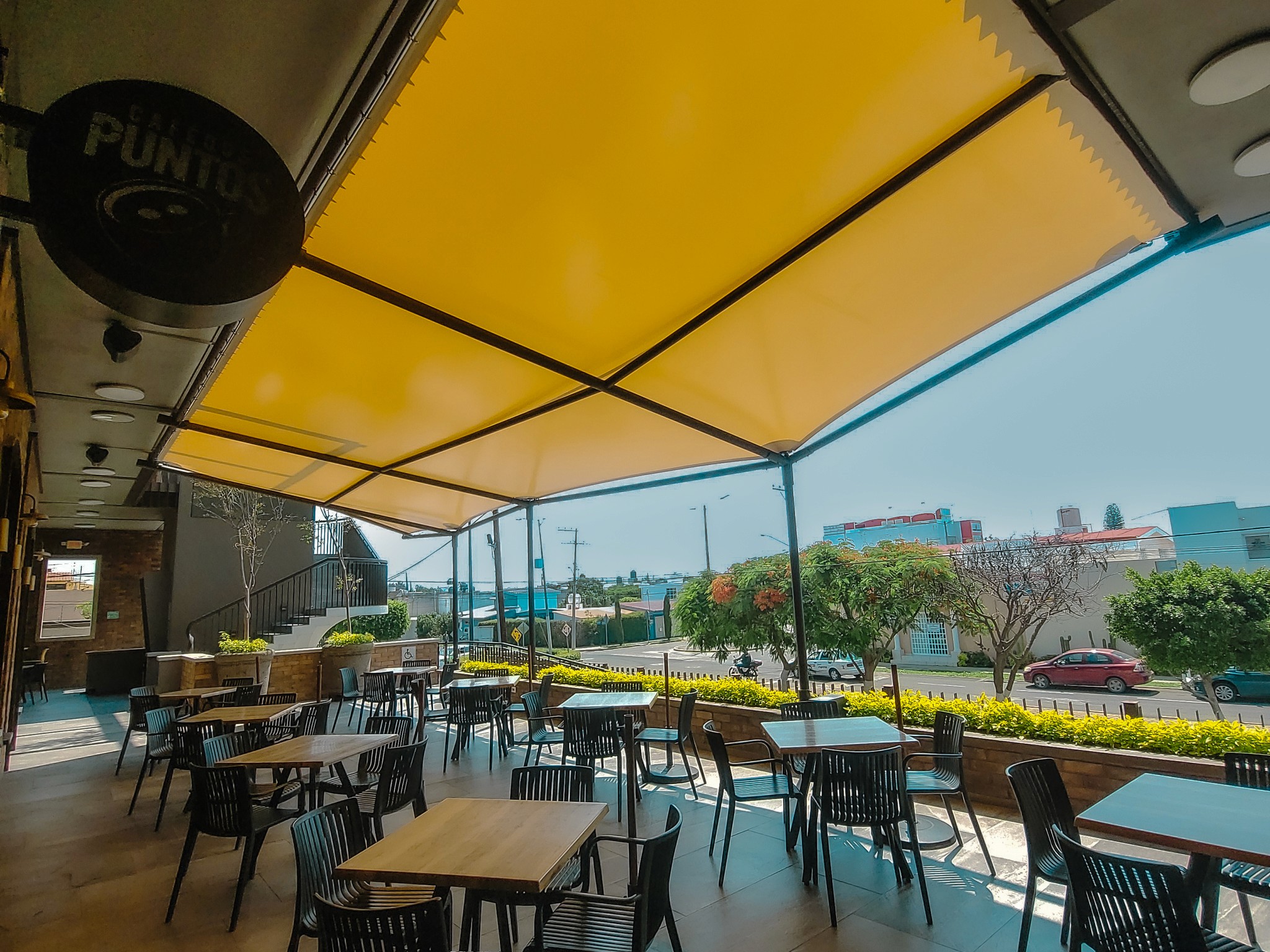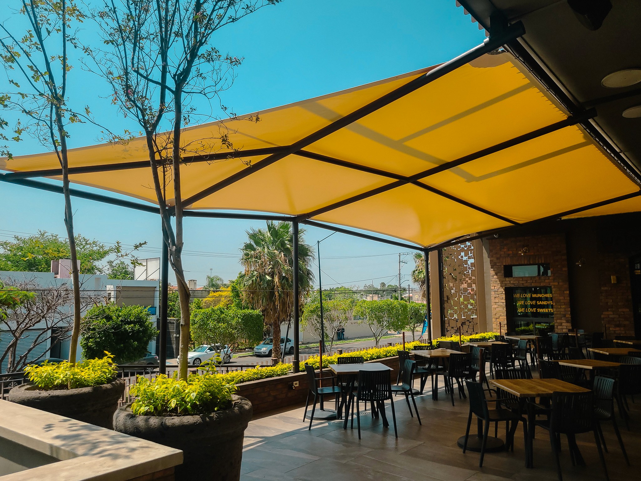 Diseñamos una solución de cubierta con membrana impermeable para la zona de comida en esta plaza comercial, brindando confort térmico y protección contra la intemperie sin comprometer la estética del lugar.