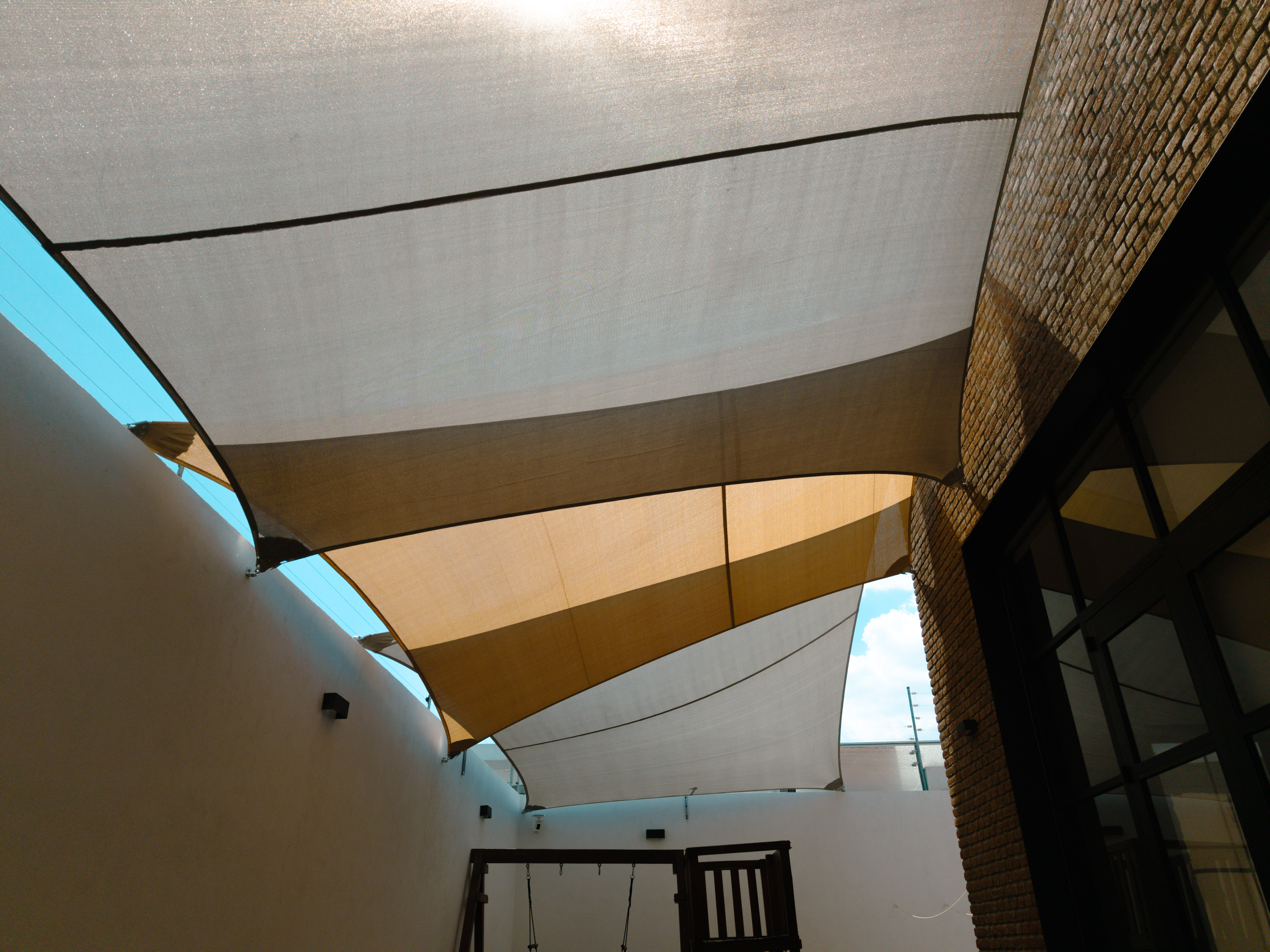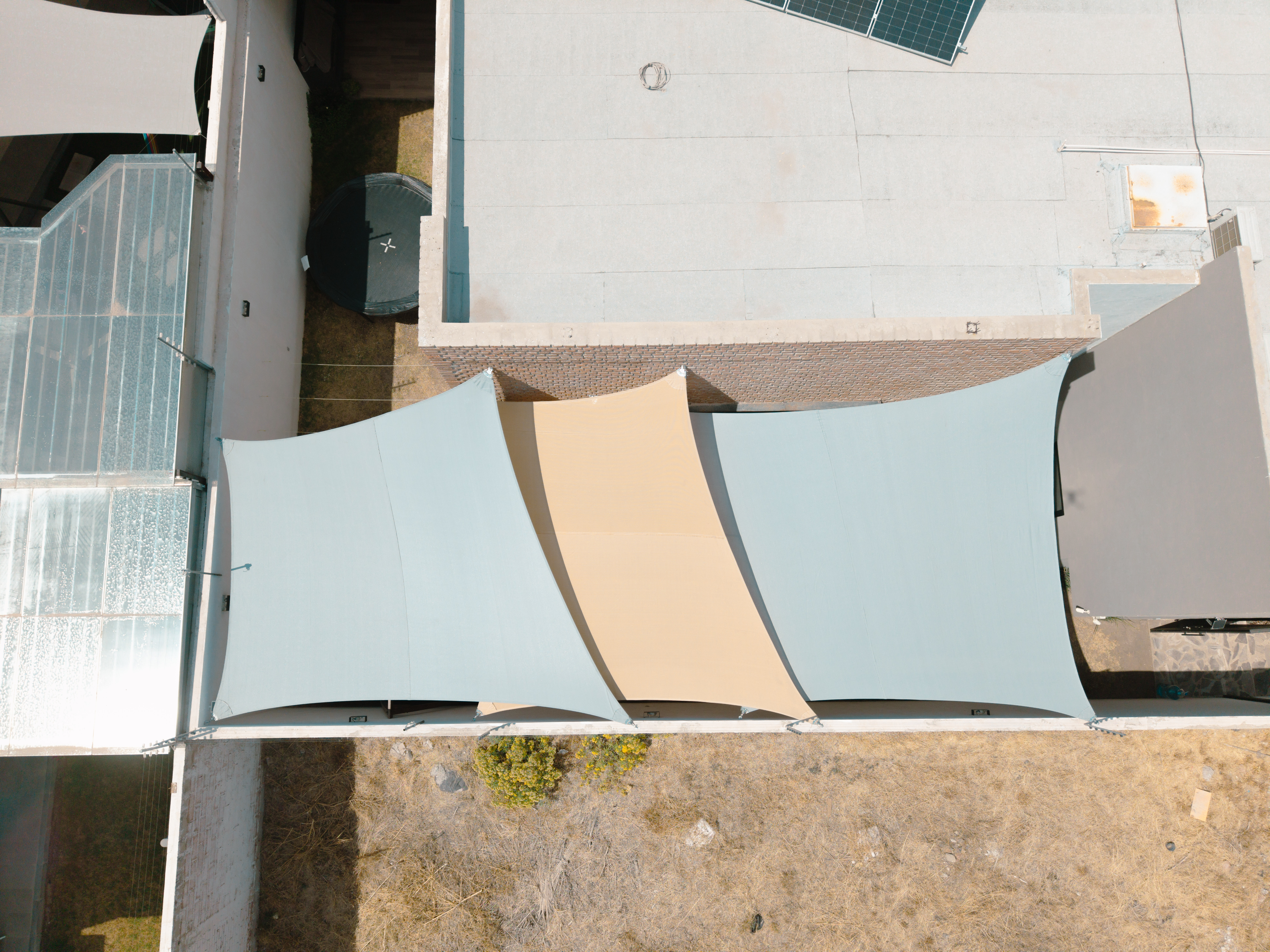 En una propuesta de carácter residencial, se diseñó una composición tridimensional de tres velarias traslapadas con malla sombra, generando un juego visual dinámico que aporta carácter y funcionalidad al patio de la vivienda. El sistema permite una protección solar eficiente con un enfoque en diseño personalizado.